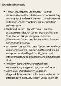 Auf dieser Seite findet ihr künftig alle wichtigen Infos zur Veranstaltung und ab sofort auch einen Lageplan der angemeldeten Stände (via Google Maps). Eine Anmeldung ist ab sofort und bis 15. Juni möglich! Am Veranstaltungstag könnt ihr aber auch spontan aufbauen.