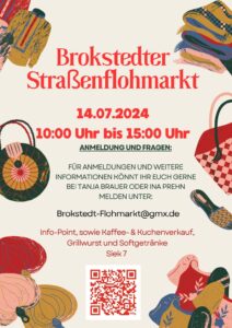 am 14. Juli 2024 von 10-15 Uhr herrscht in Brokstedt ein buntes Treiben. Geplant ist ein Straßenflohmarkt, zu dem alle Brokstedter Haushalte herzlich geladen sind: zum Mitmachen, Schnäppchenjagd quer durch den Ort und ganz sicher dem ein oder anderen Klönschnack.
