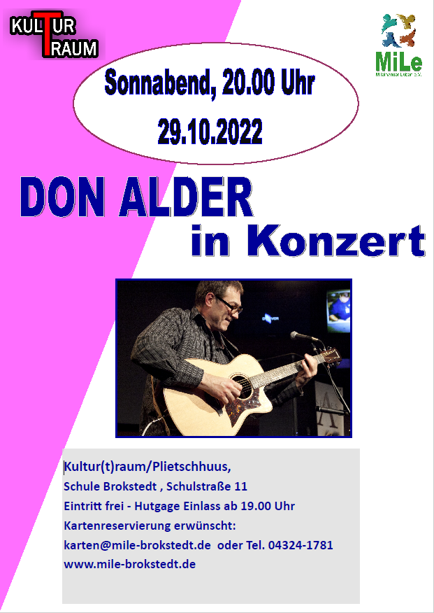 Der kanadische, mehrfach preisgekrönte Fingerstyle-Gitarrist DON ALDER kehrt für eine weitere Tour nach Europa zurück und Besucht ein zweites mal Brokstedt und den Kulturtraum. Seine selbst komponierten Songs decken diverse Genres ab.