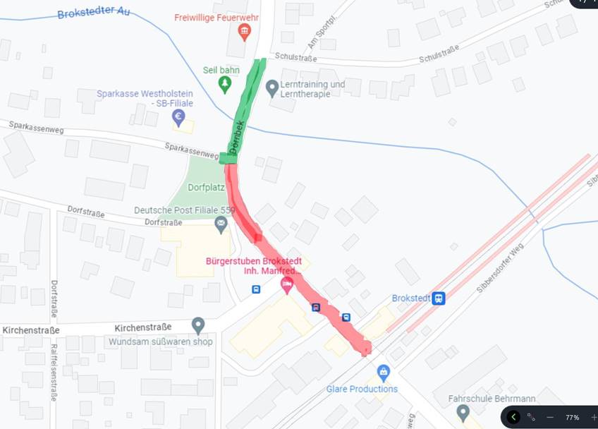 Einbau Asphalttragschicht von Bahntrasse bis Höhe Sparkassenweg inkl. Einmündungsbereich Sparkassenweg. Der grüne Bereich wird von 8:15 Uhr bis ca. 11:45 Uhr gesperrt für Aushubarbeiten und Einbau der Asphalttragschicht. Ab 11:45 Uhr wird der grüne Bereich wieder freigegeben für Anlieger- und Linienverkehr. Der Asphalt ist dann genug ausgekühlt. - Mittwoch, 10.05.2023