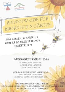 Die Saatgutausgabe startet in diesem Jahr am Gründonnerstag, den 28. März, von 16-19 Uhr im Umwelthaus Brokstedt. Weitere Ausgabetermine werden über die üblichen Kanäle veröffentlicht, z.B. hier unter https://www.gemeinde-brokstedt.de/termine/.