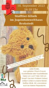 Liebe Kinder, euer geliebter Plüsch-Freund, Kuscheldecke oder Kuschelkissen haben ein Loch? Oder es fehlt ein Knopf? Gar kein Problem! Schaut einfach vorbei in unserer kleinen Stofftier-Klinik. Wir unterstützen euch zwischen 16 und 18 Uhr im Jugendumwelthaus bei kleinen Reparaturen.