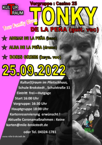 Konzertbeginn der Vorgruppe ist um 16:30 Uhr, Einlass ab 16.00 Uhr. Tonky spielt dann ab ca. 18:00 mit seiner Familie ( Family Blues)