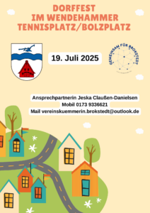 Für das Dorffest … brauchen wir noch engagierte Leute für den Festausschuss. Ihr helft dabei, das Fest (Termin: 19.7.) zu planen und durchzuführen.