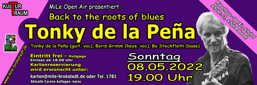 Tonky ist wieder in Brokstedt. Nach seinem fantastischen Konzerten 2019 im Kulturtraum und im Mai 2022 auf unserer Open Air Bühne, freuen wir uns ihn wieder gemeinsam mit Boris Grimm und diesmal mit seiner Tochter Alba und seinem Sohn Adrian begrüßen zu können. Wir sind sicher, dass es wieder ein grandioser Blues-Abend werden wird. Als Vorgruppe spielt bei uns aus der Nachbarschaft Fitzbek die Cover Band Casino 25.
